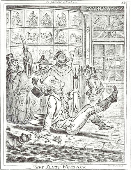 להאנה האמפרי הייתה חנות ברחוב סטראנד, ושם היו תלויות הקריקטורות של גילראי. הנה כך צייר את זה גילראי: