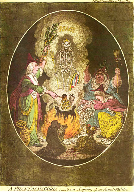הסצנה בקריקטורה לקוחה כמובן מסצנת המכשפות של מקבת. מדובר בראש הממשלה אדינגטון ושני שרים שלו שמעלים באוב את עצמותיה של "בריטניה" בעזרת כסף או מסמכים. זאת הייתה ביקורת על הפייסנות כלפי נפוליאון וצרפת, שלדעתו של גילראי הייתה משפילה. בסיר רואים שרידים של האריה הבריטי, ובחזית אפילו את ראשו הכרות ועליו התרנגול ה"גאלי", מסמליה של צרפת.