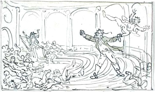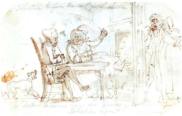 הנה סקיצה ואיור לספר שכתב ויליאם קומב. קומב היה סופר והרפתקן שבילה חלק גדול מחייו בבתי סוהר. רולנדסון הרבה לעבוד איתו. האיור הזה הוא מהסדרה סיורו של מנהל בית הספר:
