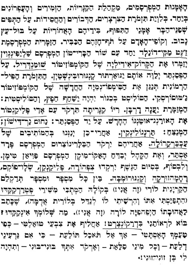 מנהלי בתי החולים היו, שימו לב, הפרופסורים דרוֹמֶדַרְווין ופֶּסְטַלוּצְבִי. ובהזדמנות אחרת הוא מספר על סוסימפוניה, צהלת הסייח בביצוע הזמר בֶּן בָּקָרוּזוֹ ועל יד הפְּסַנְטֶרֶף מנגן הוירטואוזן מר קֶנגוּרוּבינשטיין.