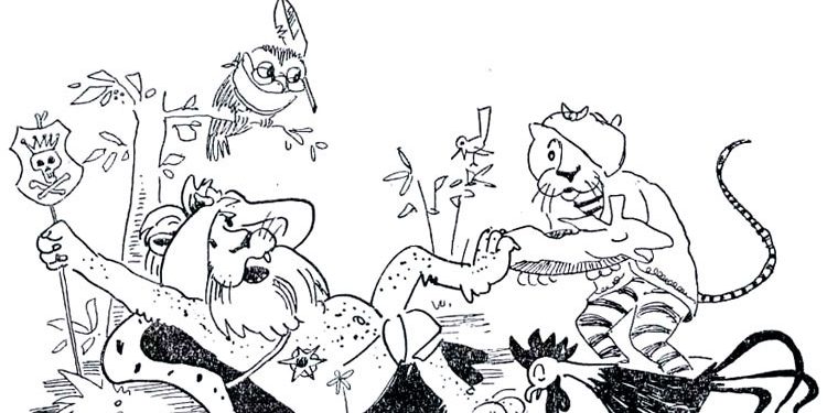 והדבר הזה עוטר באיורים שנעשו בחיתוכי לינול של דוד גלבוע, ונכתב שהם נעשו בעקבות וולט דיסני. אני לא בטוח שדיסני היה חותם על איור כזה: