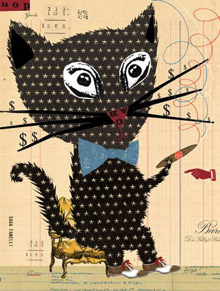 פיתחתי עניין בקולאז', גם כדי להתרחק מהצבעים השטוחים שבהם השתמשתי בקורסים של ה-BA וגם בגלל הכמות העצומה של הפיצ'יפקעס שאספתי. כשאני עושה איור של קולאז' אני מתחילה בציור הקומפוזיציה, ה- layout. אחר כך אני משחקת עם זה, שוזרת את הנרטיב עם כל החומרים השונים שבהם אני משתמשת. למשל חתיכת נייר, משהו שכבר יש לו סיפור משלו עם כתמים מוזרים; עטיפה של סוכריה; חתיכת נייר עם כתב היד של סבתא שלי- רשימת קניות, למשל. כתב יד בהקשר לא צפוי הוא מאוד מעורר רגשות. כל מיני התייחסויות, דברים בעלי חלוף, דברים שיזמינו אותך להתבוננות נוספת. אני גם אוהבת להשתעשע עם טיפוגרפיה וליצור פונטים משלי. יותר מדי מעצבים מסתמכים על המחשב בעניין הזה.