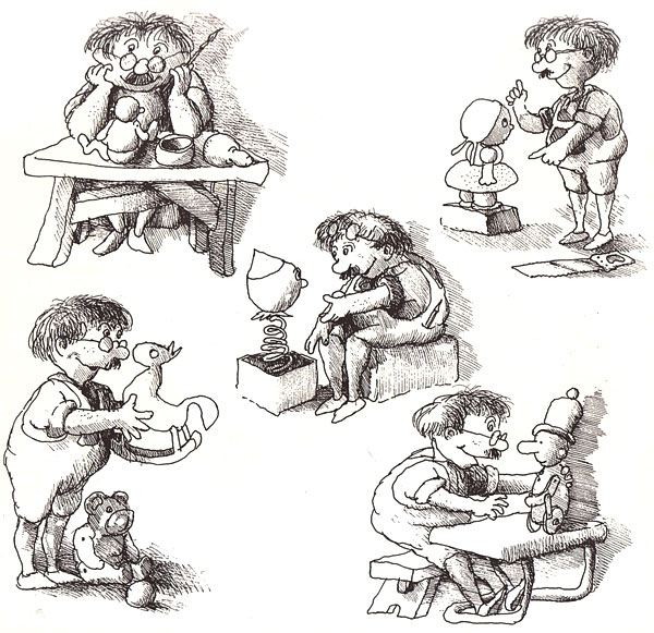 35 שנים עברו מאז איירתי את שמגר הנגר, ואינני זוכר פרטים רבים. אבל אני זוכר שזה היה אחד הספרים שבו המחבר (במקרה זה, נציגתה של המחברת) התערב כמעט בכל איור (אחרי הכול מדובר בחוקרת של "ספרות ילדים"). למרות זאת אני אוהב את הספר הזה, שהיום אין להשיג אותו. הנה ארבעה איורים ממנו: