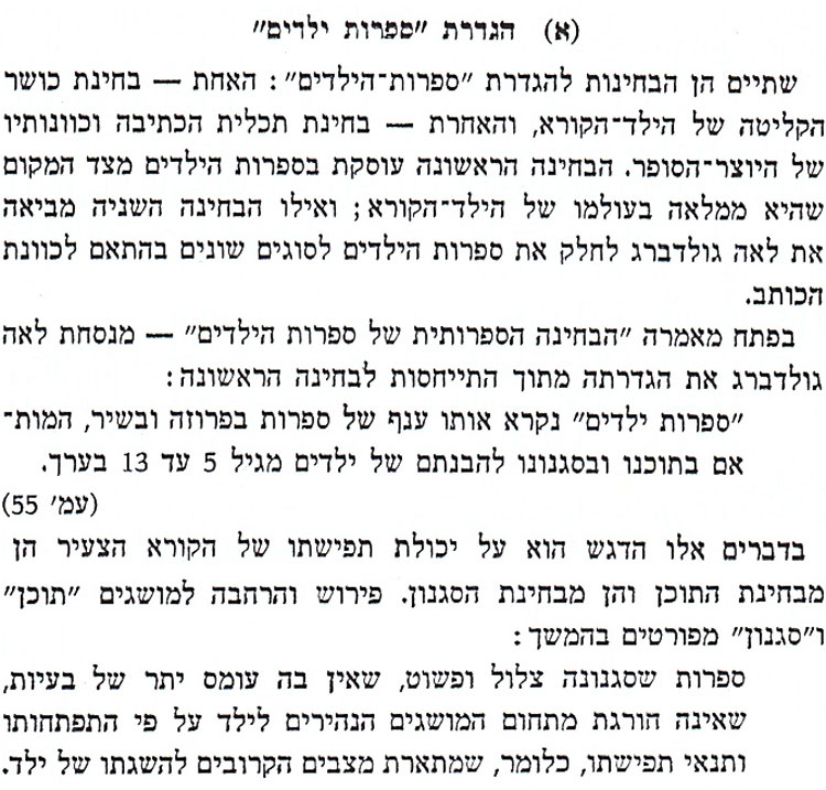 גם לאה גולדברג וגם כפילתה, שהדוקטורט שלה נעשה בהדרכתו של דן מירון, ניסו בספר הזה להגדיר את המושג "ספרות ילדים", ומי שיקרא בעיון יווכח שעצם ההגדרה מנוגדת לכל מה שאנחנו מחפשים בספרות.