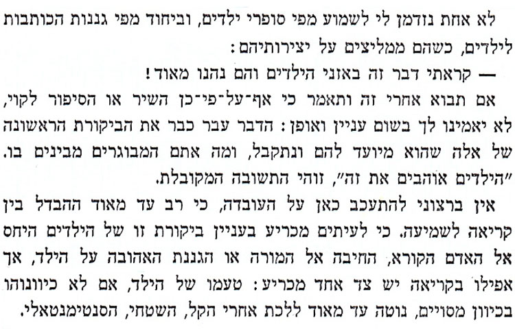 לא הייתי רוצה שהקורא יחשוב שאני מזלזל בספר בין סופר ילדים לקוראיו. אדרבא, יש בספר פנינים רבות שכתבה לאה גולדברג, שלאו דווקא מתייחסות באופן ישיר ל"ספרות ילדים".