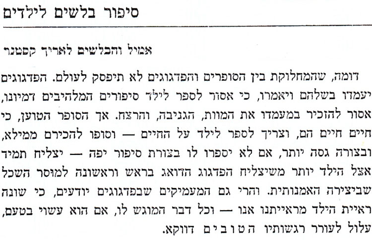 לכאורה היא מביאה כאן את השקפתה, שהיא השקפת היוצר. אבל גם כאן היא משרבבת מילים כמו "יצליח אצל הילד", שלדעתי אינם שייכים לספרות אלא לשיווק. אבל כבר באותו פרק היא מכניסה נימה של ביקורת על אריך קסטנר, שהספר שלו "לוקאלי מדי" ו"פיקח מדי".