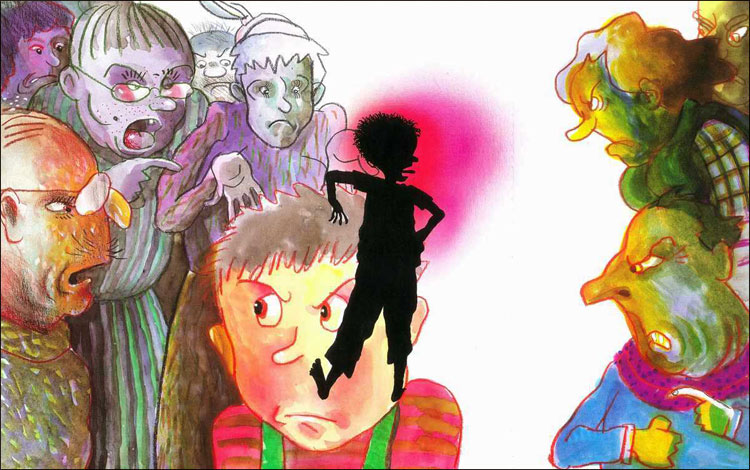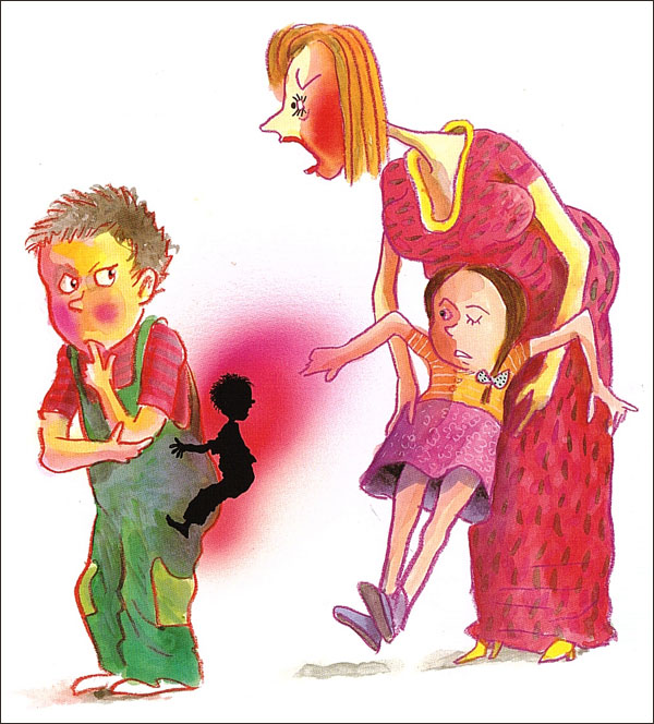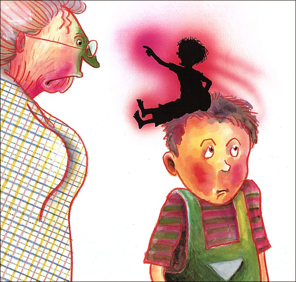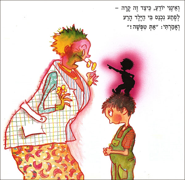 מי מאיתנו לא אהב את הילד הרע? כמובן שגם לי היה קל להזדהות איתו. אבל כשנתבקשתי לאייר אותו סירבתי. לא הצלחתי למצוא פתרון ויזואלי לסיפור. תומר, בני, שעוסק בכתיבה ובעריכה, ממש הפציר בי שאצייר אותו. ואז, כשעלה בי הרעיון לצייר את הצד הרע של הילד כמין צללית, שמחתי ועשיתי את הספר בתענוג רב. רק מאוחר יותר ראיתי שבספר צריף קטן, שם מופיע השיר, גם אריה נבון צייר מעין צללית לביטוי הרוע.