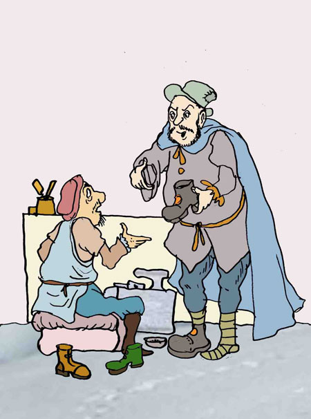 הוא חזר על סיפורו. המלך שאל אותו אם מישהו אחר בחדר נראה כמו חברו לשתייה – ואכן, המלך קצת מזכיר אותו אבל לא יכול להיות שזה הוא! האם הוא יכיר את חברו אם יראה אותו? בוודאי! אז למה שלא יחפש אותו במרתף? הסנדלר הובא אל המרתפים.