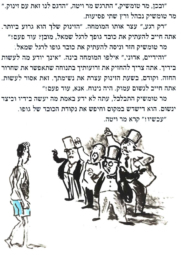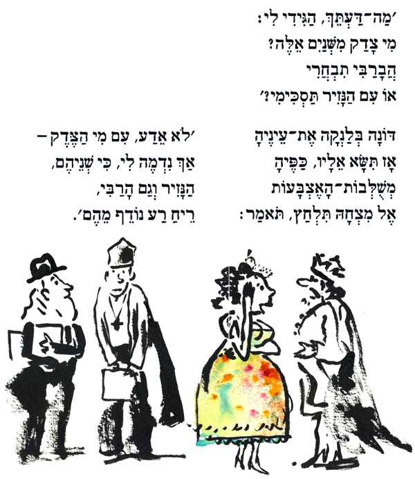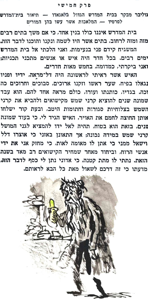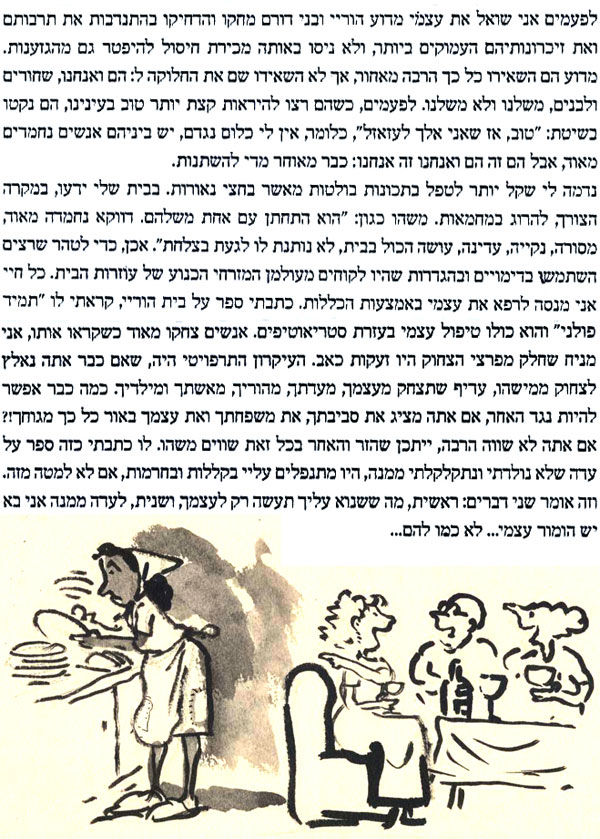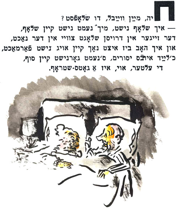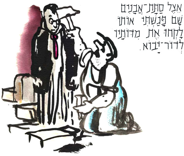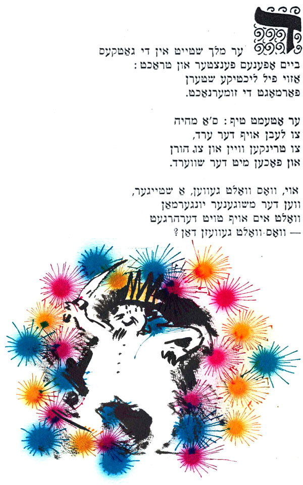 עד היום "המגילה" באידיש, בכיכובם של הבורשטיינים, היא ההצגה שהכי נהניתי ממנה בתיאטרון הישראלי, וראיתי אותה שלוש פעמים. הציור שעשיתי כאן לשיר מתוך המחזה, מושפע מהביצוע הנפלא של פסח בורשטיין בהופעה ההיא: