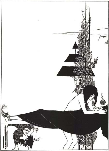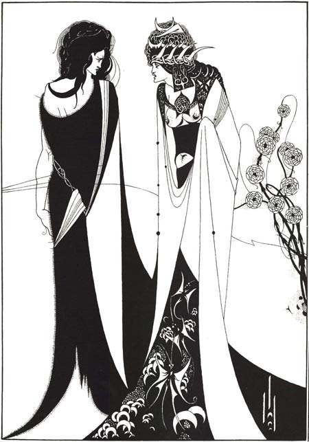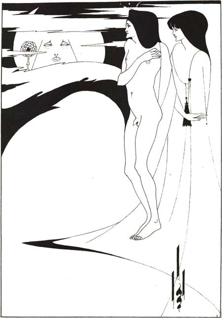בשלב הזה החזה שלה מוסתר (ראו להלן). היא לבושה בהמון בד ורק הברכיים שלה חשופות, ורואים שבירדסלי השקיע הרבה באיור שלהם.
