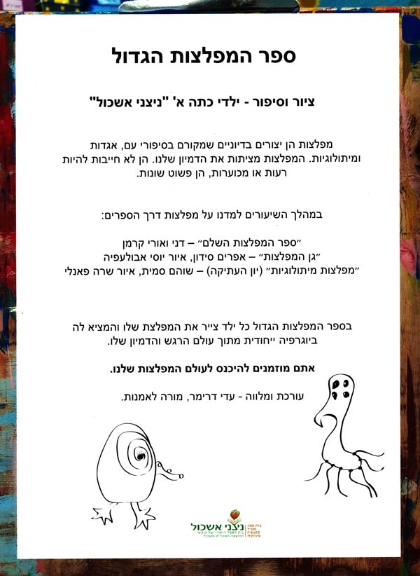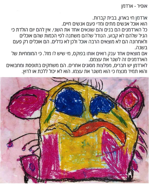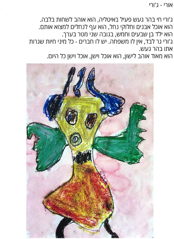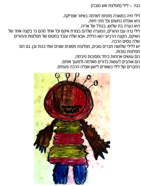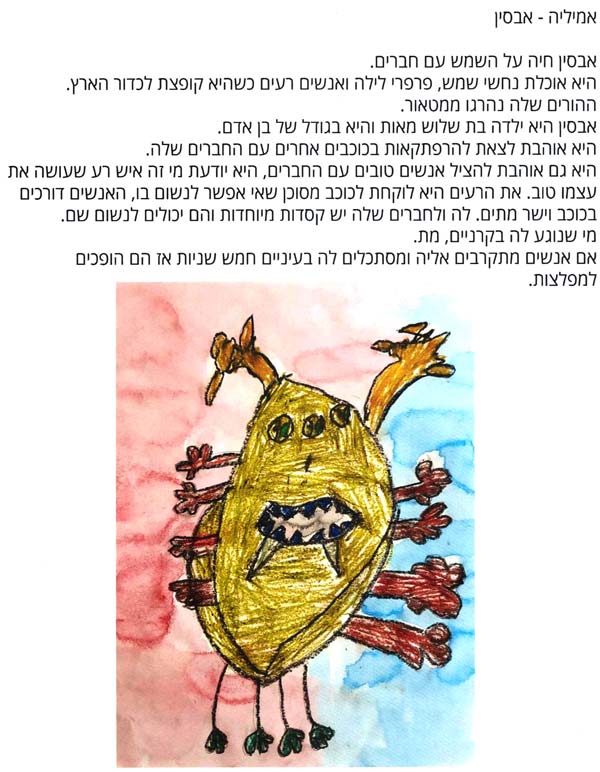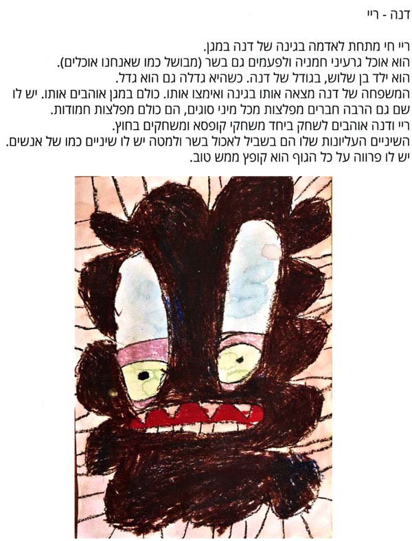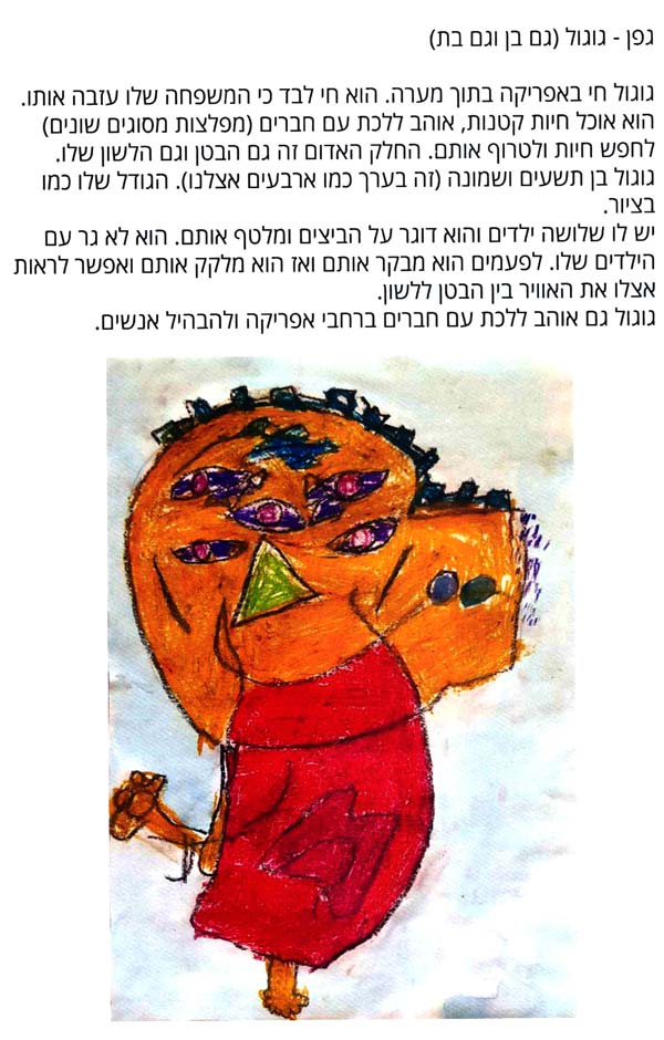 מתוכו בחרתי (באופן די אקראי ולשם הגיוון) 13 מפלצות שאני שמח להראות לכם. הטקסט גם הוא נכתב על ידי הילדים (כיתה א'!!).