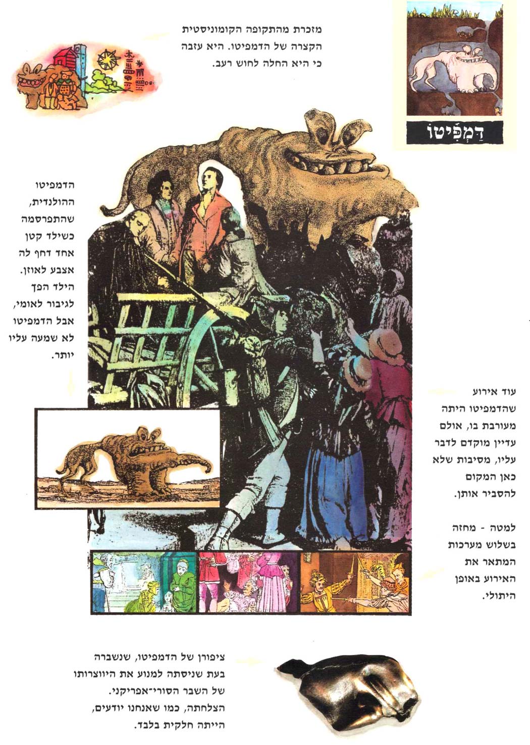 בספר התרכזנו ב-21 מפלצות, שלכל אחת הקדשנו ארבעה עמודים. הנה למשל ארבעת העמודים של הדָּמְפִּיטוֹ. בעמוד הראשון – טקסט אקדמי למהדרין: