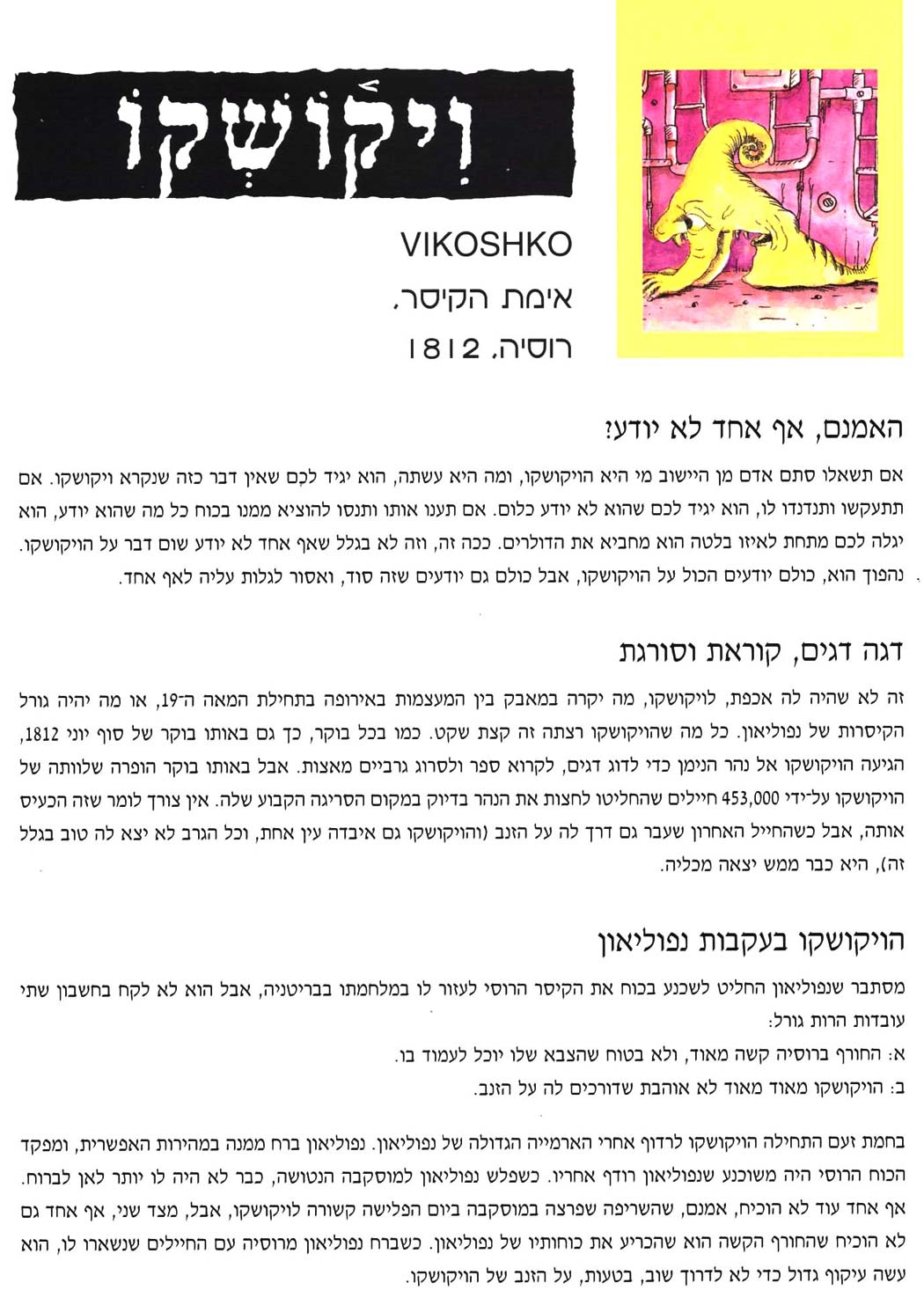 צחקתי לא מעט. לספח מפלצת לארוע הסטורי כלשהו, מצטייר בעיני כרעיון אפקטיבי,- כמו שנהוג אצלינו להבטיח ריבוע שוקולד, כפרס, לפתרון נכון בש"ב בחשבון. בנוסף, נסו לקרוא את המפלצות בלשון מלעיל (מיונד, ויקושקו ) וקבלו גם שיעור בהונגרית! משעשע בטירוף. רחלי