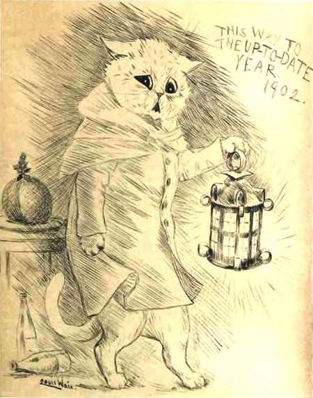 בשלב מסוים הוא העמיד את החתול על שתיים וגם התחיל להלביש אותו, וכך התחילה קריירה ארוכה ומסועפת של מי שייזכר כצייר החתולים הידוע ביותר, ובעיקר מי שהעניק לחתולים אופי והאניש אותם, כמו בכרטיס הזה לשנת 1902 שמציע לכם להיכנס אליה בשקט ובזהירות ולהאיר את הדרך: