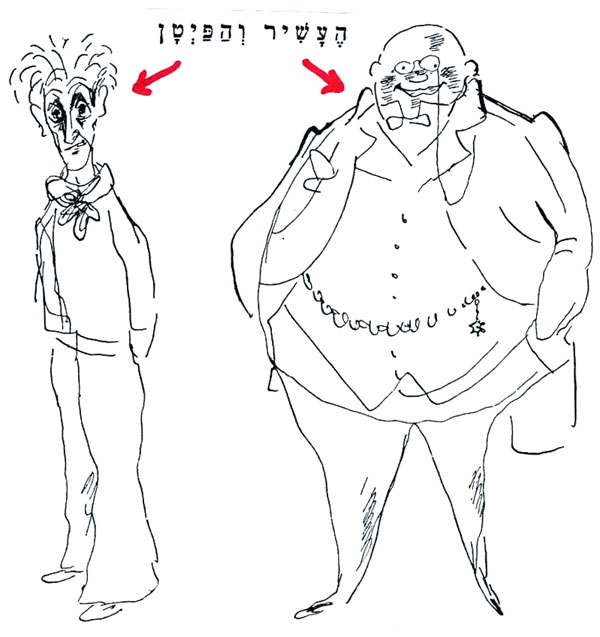 ולמרות שכמעט איש מחבריו המשוררים לא היה כל כך רזה, גוטמן צייר אותו כמעט מורעב, רק כדי לנגד אותו עם העשיר השמן.