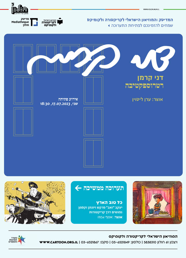 מאחר שכבר קיבלתי את ההזמנה לפתיחת התערוכה שלי במוזיאון לקריקטורה וקומיקס בחולון, אז הנה היא. כולכם מוזמנים: