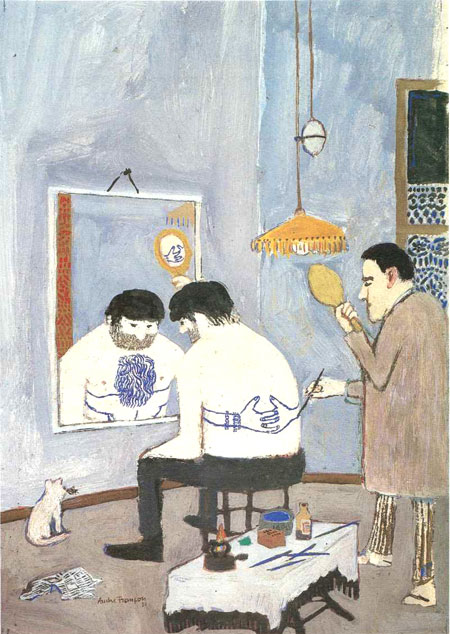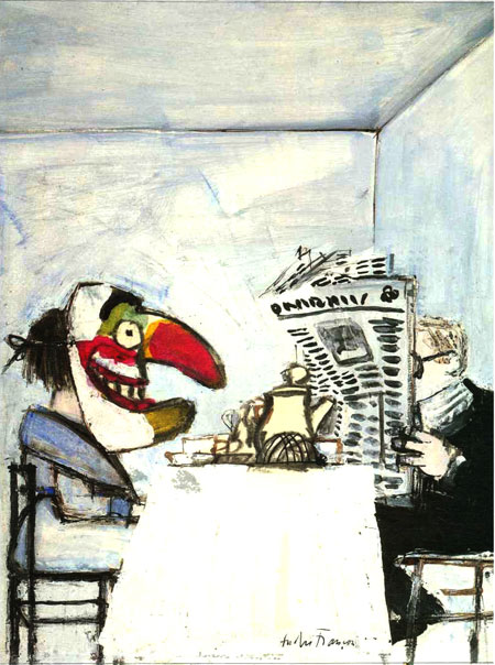למרות שכבר כתבת עליו, בפעם הקודמת הוא נבלע ברשימה שהיו בה עוד כמה. עכשיו חזרתי לרשימה ההיא ובחנתי אותה ביותר תשומת לב [ אולי זה קשור גם לחופש הגדול] והרגשתי שפיספסתי מכה בראש עם פטיש חמישה קילו. הגנרל המקסיקני והאישה עם מסיכת הליצן מול הגבר הקורא בעיתון, הגברים שמסתכלים על הבחורה במקום על הפיל הרוכב על אופניים והצייר שמצייר את מגדל אייפל ומתעלם מההמולה ברחוב, יכולתי להמשיך פה בתיאורים מילוליים- אבל תיכף נגמר המקום באינטרנט. הוא מצויין, באמת מגוון, קשה להאמין שזה בן אדם אחד.