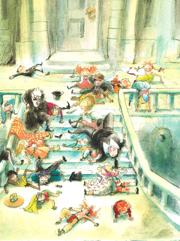 אז נעלם הפיל ובמקומו שכבו על המדרגות 22 היתומים.