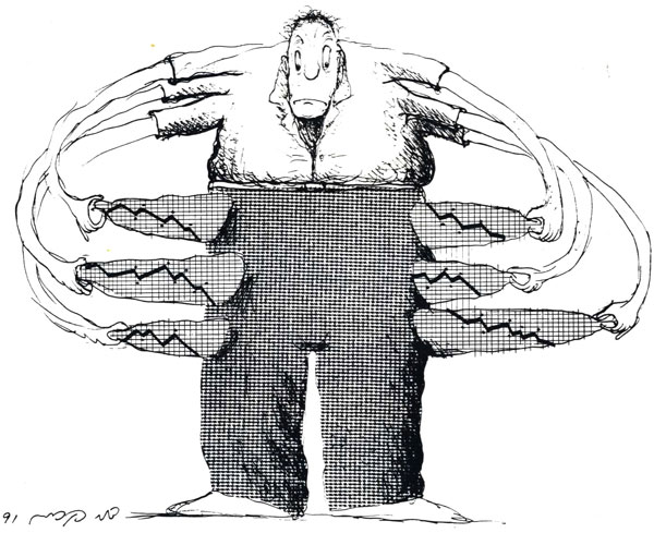 הבאתי כאן מדגם מייצג. את האיור הבא אין לי מושג מתי ולמה איירתי, אבל ברור שזה היה בעיתון הארץ, לפי החתימה "אריה דן":