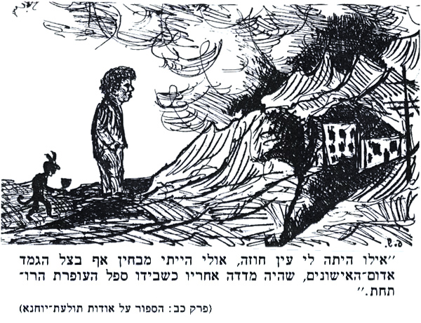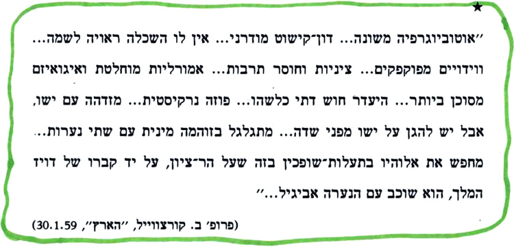 הכעס שהוא השקיע בתגובה שהופנתה לא רק אליי, אלא לכל מי שנכח שם, הייתה מפתיעה. אני חושב שהיה לו קושי עם קומתו הנמוכה. אגב, כשציירתי אותו כמין נביא, טרם פגשתי בו ולא ידעתי מה גובהו.