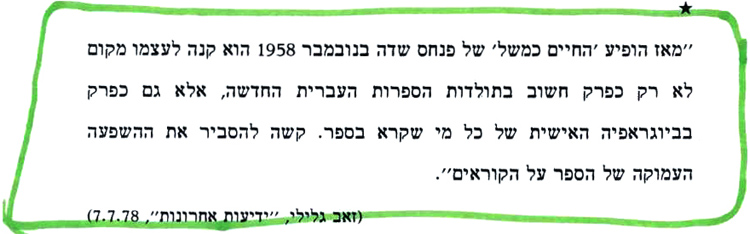 ההיכרות שלי עם פנחס שדה הייתה קצרה ושטחית. פגשתי אותו פעמיים אצל חבר משותף, בנימין תמוז. הפגישה הראשונה הייתה בשבוע שבו התפרסם במוסף השבועי של ידיעות אחרונות ריאיון שערך איתו יעקב אגמון בגלי צה"ל, והיו בו שני איורים שלי: