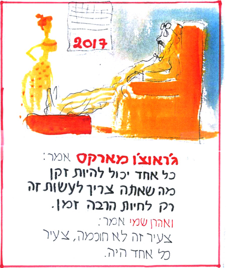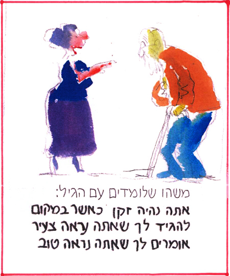 אבל הארכיון שלי, שבהרבה מקרים לא מסכים איתי, מגלה לי שכבר לפני שבע שנים, כשהייתי צעיר בן 77, הכנתי (אני כבר לא זוכר למה) סדרת איורים מלווים בטקסטים הומוריסטיים על זִקנה.