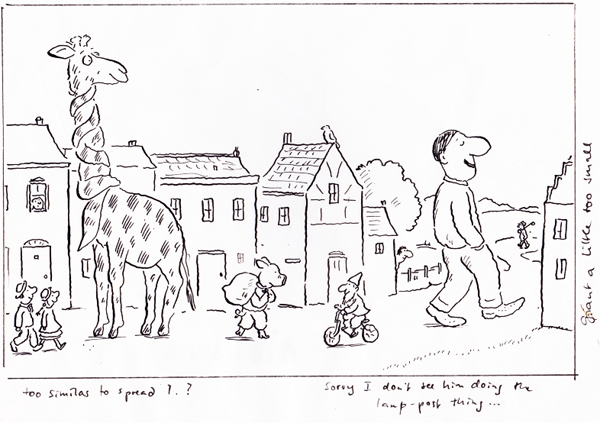 היא שולחת את הטקסט שלה להוצאה ומבקשת שישאלו אותי אם אני רוצה לאייר את זה. אז אני פוגש את המו"ל והעורך כדי לדבר על איך ייראה הספר, ואנחנו מחליטים יחד מה אני אצייר בכל עמוד. ואז אני מתחיל לפתח את הדמויות, בדרך כלל בסקיצות קטנות, אחר כך מגדיל ומראה את זה למו"ל, לעורך ולג'וליה. וכאשר כולם מרוצים אני מתחיל לעשות את האיורים.