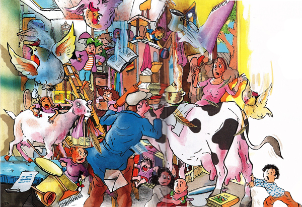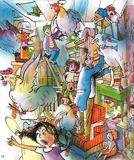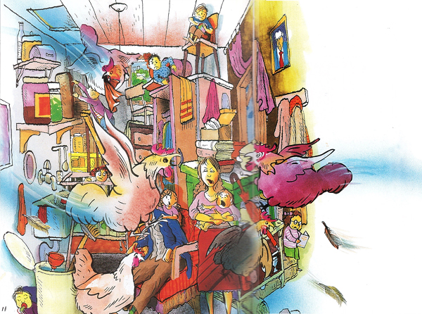 לי, כמאייר, עניין הצפיפות היה חשוב. כך ראיתי את הבית כששמעון, גיבור הספר, הכניס אליו את התרנגולות: