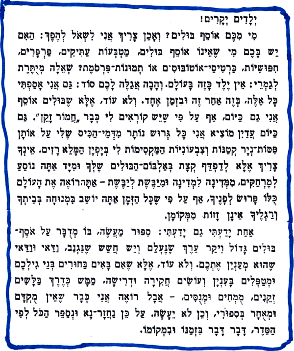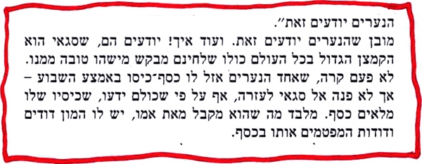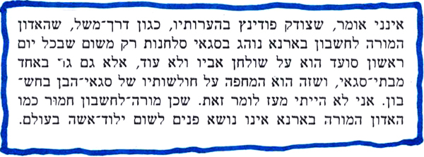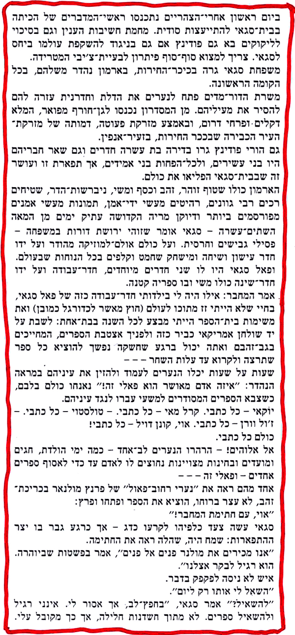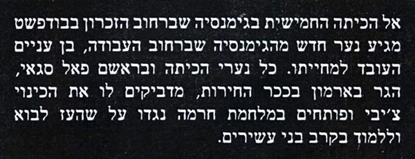 "המורה אדמוב לא גער בסגאי בגידוף נמרץ ולא אמר לו בסגנונו הזר: זוהי אינה התנהגות אלא מוגת לב ולא היה מוליכו בבדל אוזנו אל המקפצה".