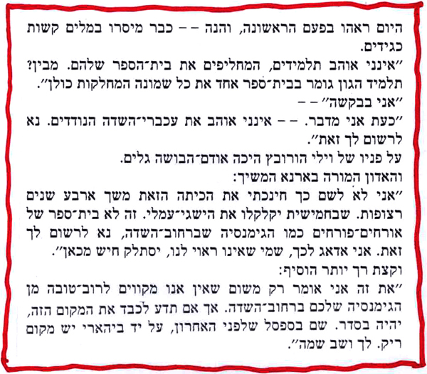 אני זוכר שכילד שנאתי את המורה הזה, שלימים התגלגל בדמותו של המורה לאנגלית בבית הספר החקלאי בפרדס חנה, שדאג שיעיפו אותי משם.