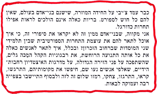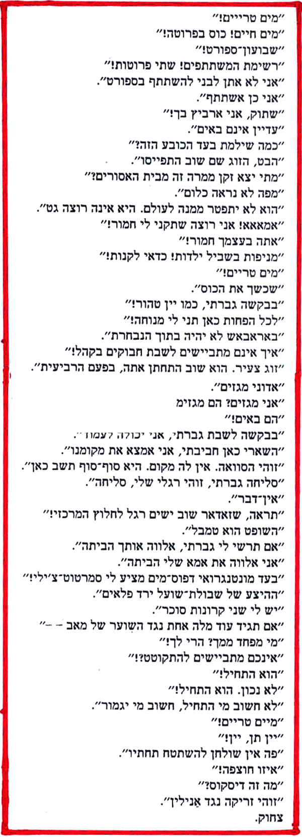 ומייד בהמשך הוא מביא שני עמודים שבהם רק משפטים מפיהם של האנשים שביציעי אצטדיון הכדורגל. אם אתם שואלים לדעתי, זהו שיאו של הספר: