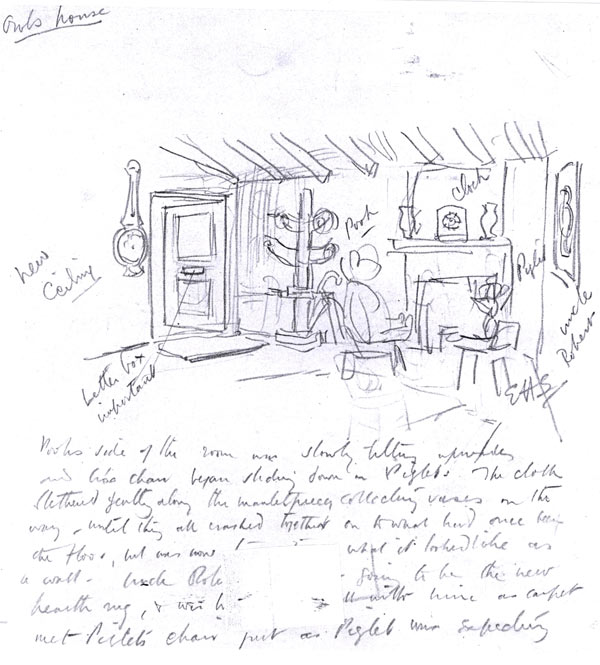 כדי להגיע לזה הכין שפארד, בתיאום על מילן, סקיצה של פנים ביתו של הינשוף במצב נורמלי. במקרה זה הסקיצה היא חופשית מאוד ומלווה בטקסט, והיא נעשתה רק כרישום עזר ולא הפכה לאיור: