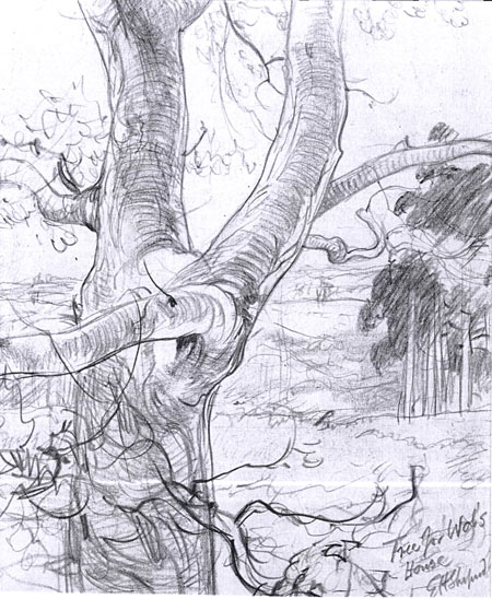 פה רואים שלתיאור הפלסטיות של העץ וענפיו הייתה לשפארד טכניקה ידועה של קווקווים מקבילים:
