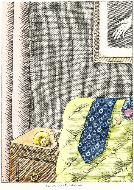 ואילו אצל לה-טאן המסגרת היא יסוד חשוב וכמעט עיקרי באיורים רבים. הוא ממש אומר לנו: "את העיקר אני לא מראה לכם. לפי מה שאתם רואים, עליכם לנסות ולפענח את השאר". הנה איורים מתוך סיפור שנקרא המוזרים שבעולם: