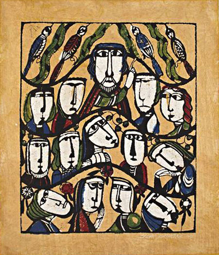 אחזור קצת לאחור בזמן, לאמן יפני בשם ואטאנאבה (1996-1913). הוא היה אמן הדפס מעניין, שאהב לצייר קבוצות של אנשים, והציור שלו מאופיין בקווי מתאר חזקים בעלי אופי משתנה. הדמויות שלו מסוגננות בסגנוּן שמשכיח כל מבנה אנטומי: