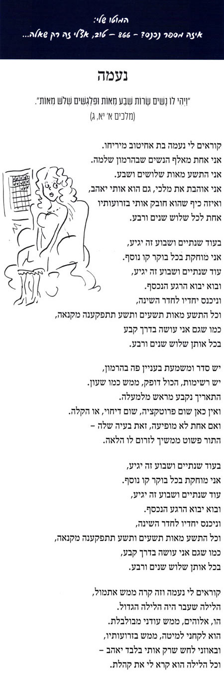 המקאמה על נעמה למשל נכתבה עבור "ניקוי ראש" בשנת 1977. ו"הבדיחה השחוקה" על שרה והמלאכים, ש"היהודים באים" עשו כל כך יפה, נכתבה ב-1980. ואת יודעת מה, גם נעמה וגם שרה בוצעו על ידי חווה אלברשטיין ללחן של משה זורמן. חבל שלא ידעת, יכולת להכניס גם אותם לרשימת החרמנים. מרגיש קצת כמו אווירה של בורות.