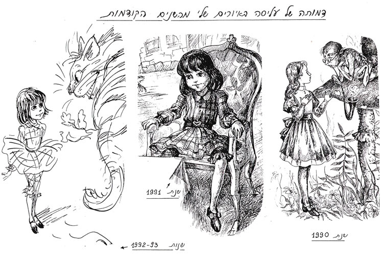 מתישהו בתחילת שנות ה-90 הגיע אליי הזוג ויינשטיין, עולים חדשים מברית המועצות, עם בתם בת ה-15 או ה-16, ז'ניה (יבגניה). הם הראו לי עבודות של ז'ניה שעשתה עוד בברית המועצות, ואני ראיתי אצל הילדה המקסימה והביישנית כישרון בלתי רגיל. הצעתי לז'ניה ללמוד אצלי, ואפילו ללא תשלום. ההורים שלה קצת היססו אבל לשמחתי הסכימו. ז'ניה התקבלה לבית הספר "תלמה ילין" ולמדה גם שם וגם אצלי. בדצמבר 1993, ז'ניה עשתה עבודת גמר בהנחייתי בנושא אליס בארץ הפלאות. כדי להציג את הכישרון יוצא הדופן של ז'ניה, הנה כמה עמודים מהעבודה שלה, איורים ל"אליס":