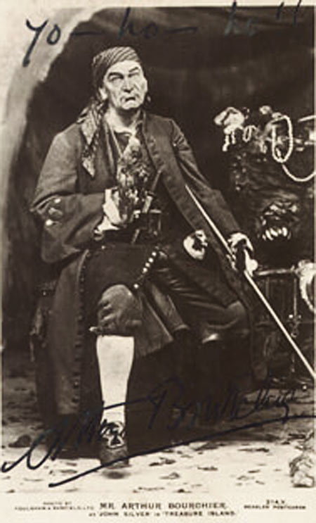 אז עוד לפני שאציג את ג'ון סילבר הארוך באיור, הנה כמה סילברים מהבמה ומהקולנוע (לאו דווקא לפי סדר כרונולוגי). אחד הראשונים על הבמה היה השחקן ארתור בורשייה (Arthur Bourchier) ששיחק במחזה בשנת 1883:
