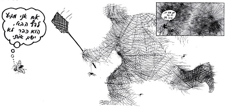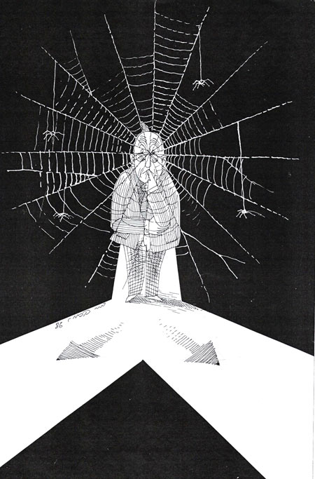 כשאני בודק מתי אני משתמש בקורי עכביש באיור, מתברר שבדרך כלל זה לסמן זמן שחולף, כמו באיור הזה משנת 1986 שהופיע ב"ידיעות אחרונות" ונעשה לרשימה שעסקה באנשים שלא מסוגלים להחליט: