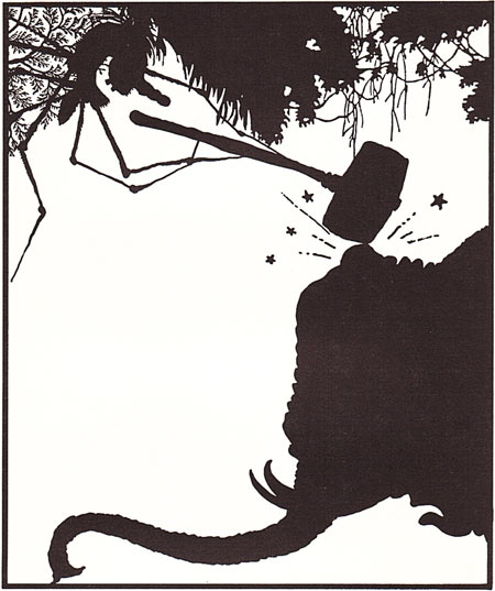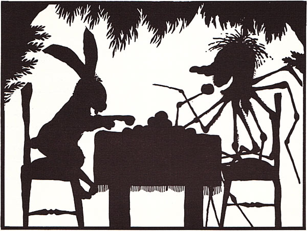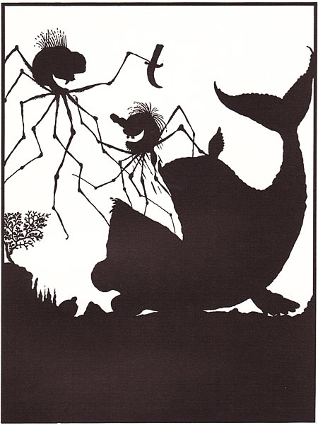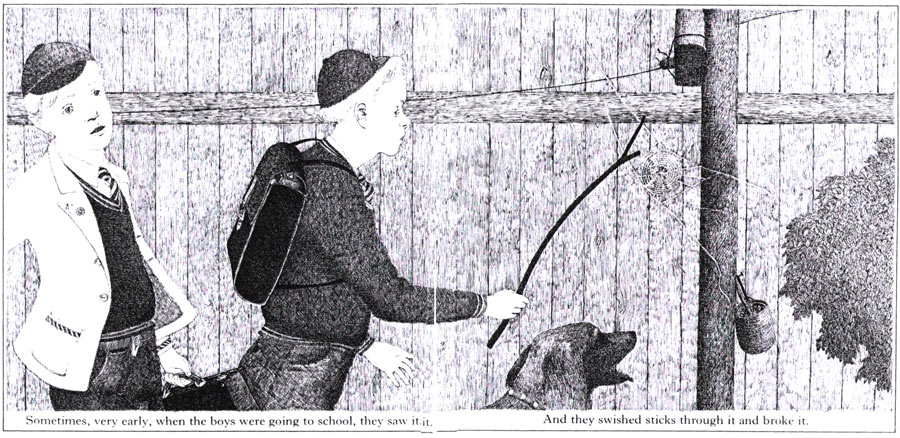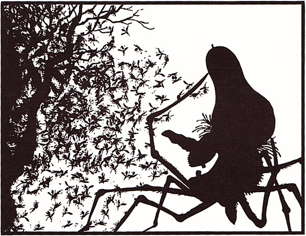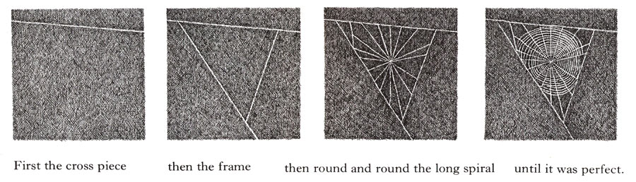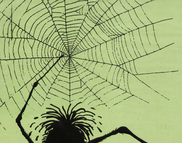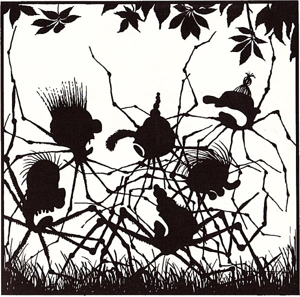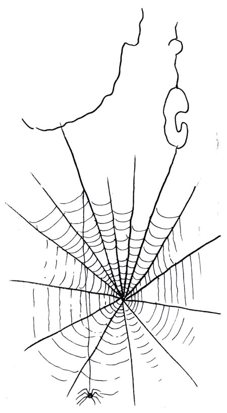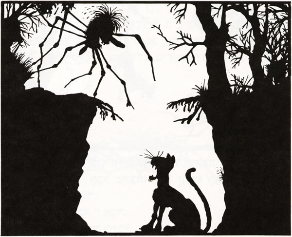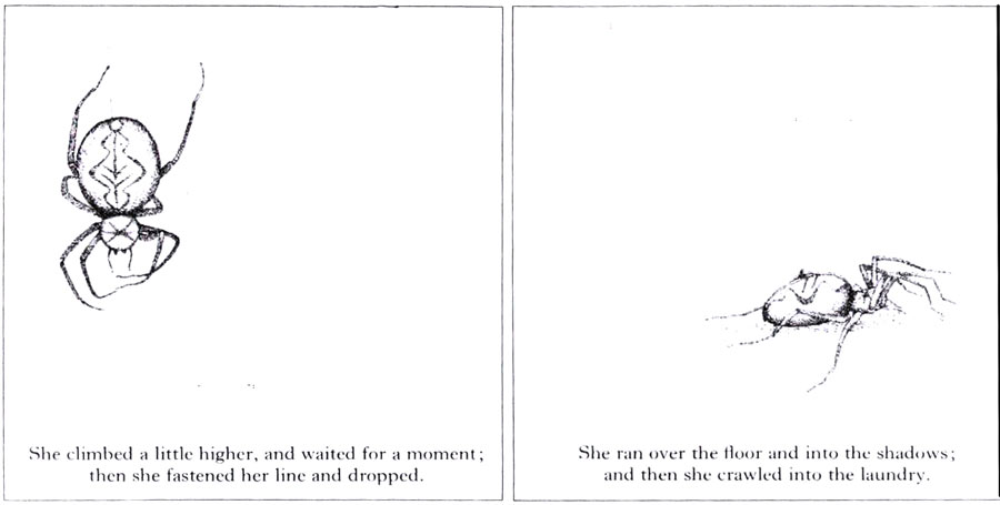 כמו שאתם רואים, האיורים שעשיתי לספר הם בעצם צלליות. הייתי די מרוצה מהאיורים דווקא בגלל שהם שונים. בכל הספר נמנעתי מלצייר קורי עכביש, ורק בעטיפה ציירתי קורים, ולא תופתעו שגם אני עשיתי בהם את הטעות הנפוצה: