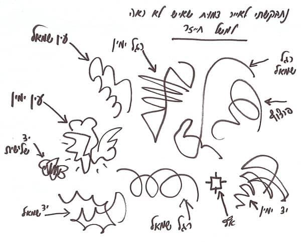 פעם, כשהתבקשתי לצייר על הלוח דמות דמיונית שאיש לא ראה, נניח יצור מהחלל, ציירתי אותה כך והצבעתי על אבריה השונים (כאן כתבתי אותם):