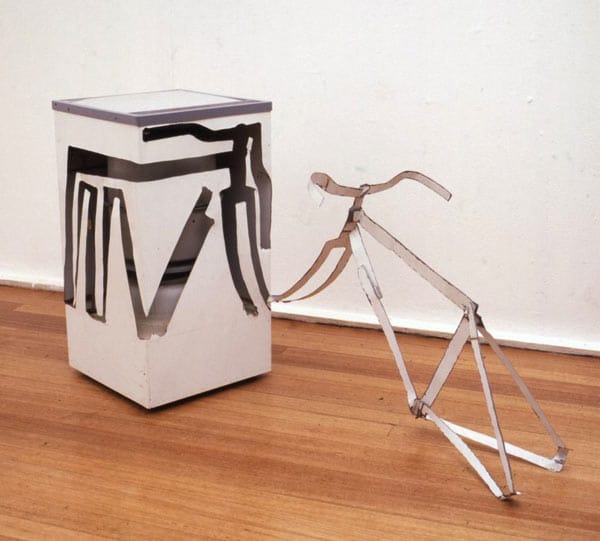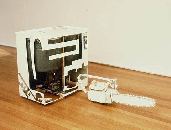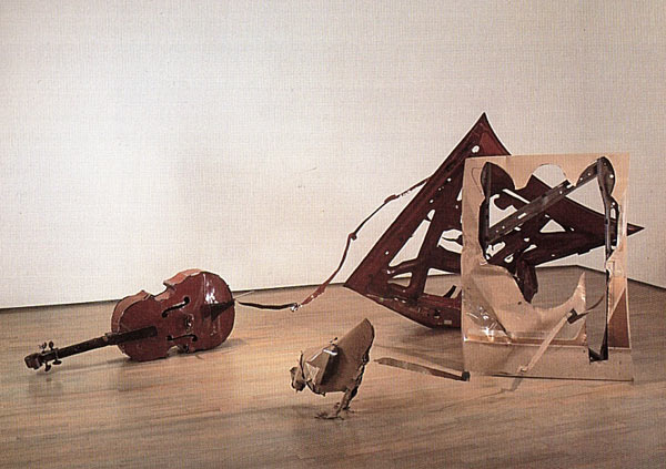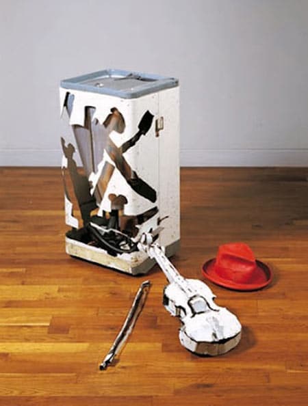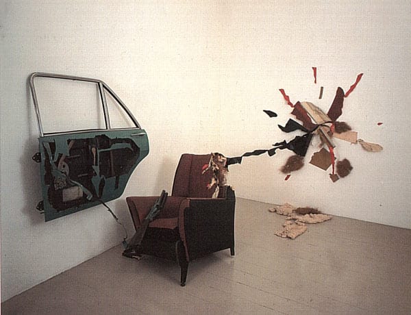 או רובה, שנבנה מקיפולי פח גזור, גם הוא ממכסה מכונית, ו"ירה" בכורסה, שחלקים ממנה ניתזו אל הקיר: