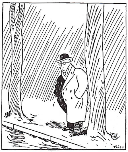 אבל טרייר המצוין בחר לאייר את פוגה שעומד בגשם וצופה בבתו – סצנה סטטית – אבל איזה איור נפלא, וכמה דמיון צריך כדי לעשות איור פשוט כזה!