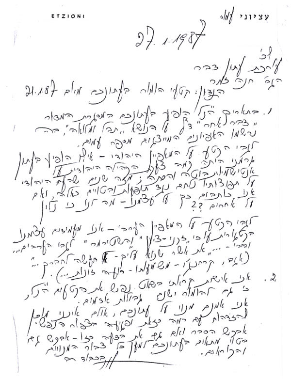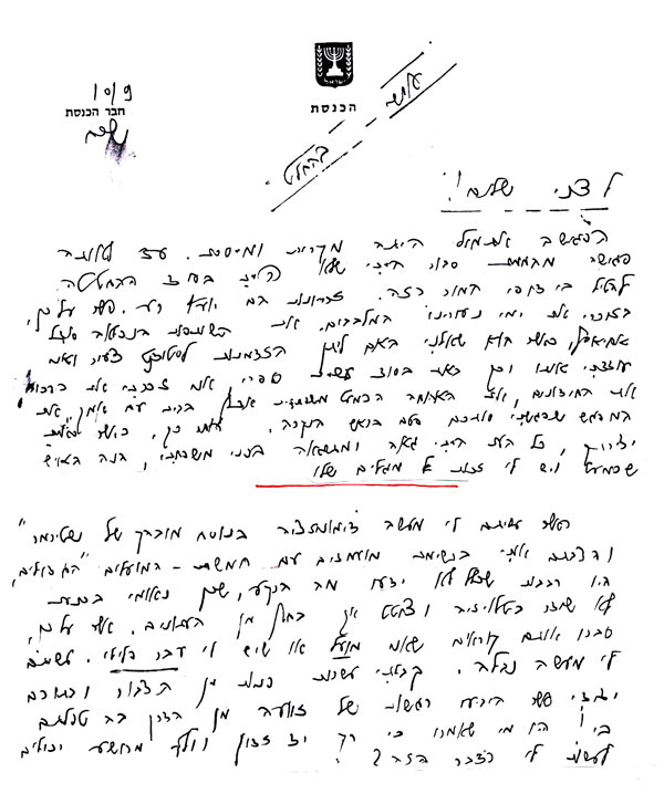 לדני שלום! הפגישה אתמול היתה מקרית ומייסרת. עד לאותה פגישה מקוממת סבור הייתי שלא היית בעד ההחלטה להטיל בי דופי חמור כזה. זיכרונות הם יועץ רע. אשר על כן, בזוכרי את ימי נעורינו המלבבים, את השותפות הנפלאה אצל אחיאסף, כאשר הוא שאלני האם ליתן הזדמנות לסטודנט צעיר ואני עודדתי אותו וכך באת בסוד עשיית ספרים, אני זכרתי את כרכור, את החידונים ואת הארוחה הכמעט משפחתית אצלך בבית עם אימך, את המפגש שפגשתי אתכם פעם בראש הנקרה. אחר כך כאשר ראיתי יצירתך. כל העת הייתי גאה ומתגאה בפני משפחתי, הנה האיש שכמעט ויש לי זכות של מגלים שלו. כאשר עשיתם לי מעשה דזדמונה בנוסח מובהק של "שטירמר" והצבת אותי ברשימת מועמדים עם חמשת המועלים הגדולים, היו רבבות שכלל לא ידעו מה הרקע, שכן נאומי בכנסת לא שודר בטלוויזיה וצוטט אך בחלק מן העיתונים. אף על פי כן סברו אותם קוראים שאני מועל או שיש לי עבר פלילי. עשיתם לי מעשה נבלה. קיבלתי עשרות פניות מן הציבור ובתוכן ידידיי, אשר הביעו רגשות של זוועה מן הדרך בה טיפלתם בי! היו מי שאמרו כי רק יד זדון וילד מרושע יכולים לעשות לי כדבר הזה.
