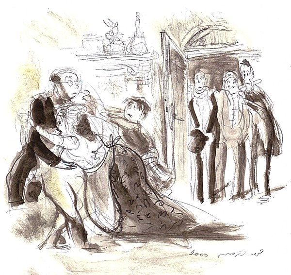 והנה כמה איורים שעשיתי לגיבורי הספר. האיורים לא הופיעו בספר, והם נעשו לצורך הרצאה שהעברתי בזמנו בבית אריאלה: