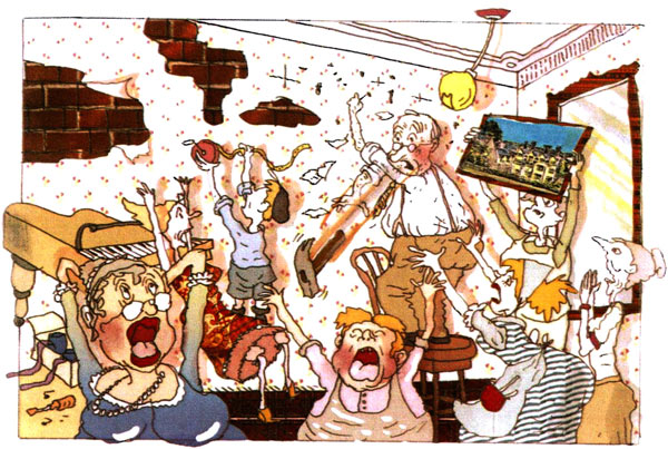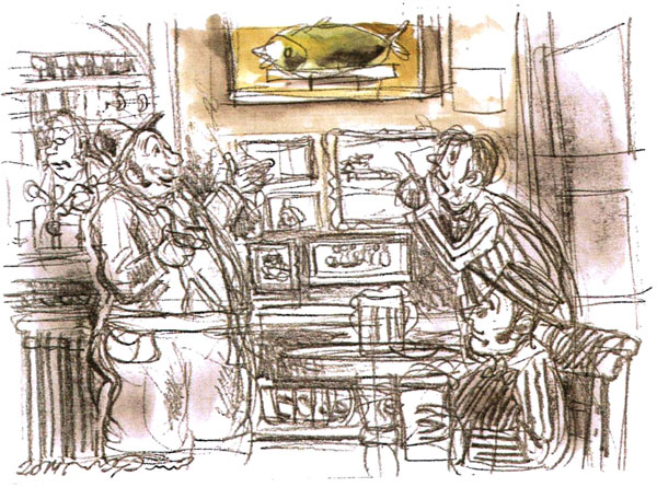 הנה שני איורים שלי. הראשון לסצנה שבה הדוד פודג'ר תולה תמונה: